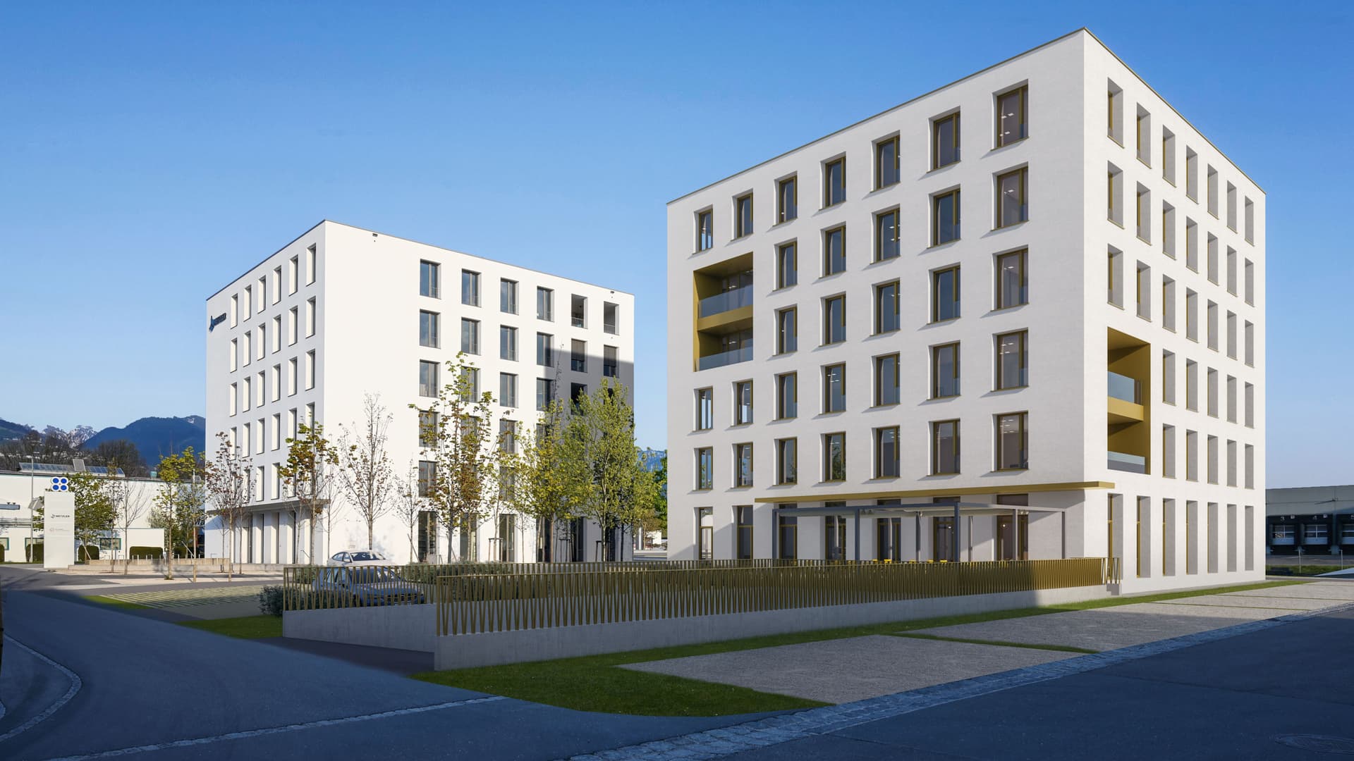 Auf einem nahezu quadratischen Grundstück entlang der Bundestrasse in Röthis, wurde auf Basis eines städtebaulichen Grundkonzepts die erste und zweite Baustufe zweier miteinander korrespondierender Baukörper in unterschiedlichen Zeitabständen realisiert. Bei den Gebäuden handelt es sich um kompakte, würfelartige Baukörper in einer kompakten Ziegelbauweise mit heller Putzfassade und großen Fensteröffnungen. Die 6-geschossigen Gebäude umfassen Büroflächen, Produktion im EG sowie eine großzügige Tiefgarage.