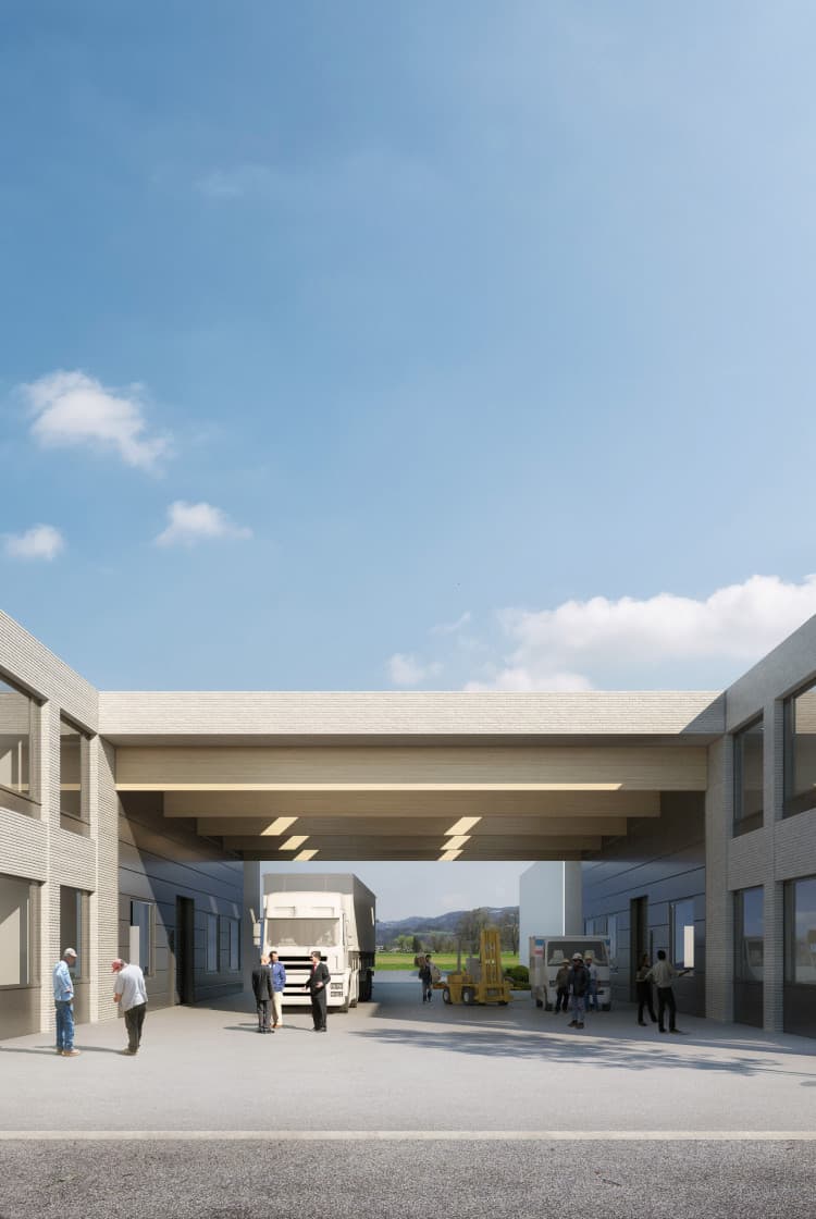 Der Neubau befindet sich im Gewerbegebiet Millennium Park im Süden von Lustenau und umfasst 2 Produktionshallen mit dazugehörigen Büros und Tiefgarage. Die Bürotrakte und Hallenaußenwände wurden in Massivbauweise mit Klinkerfassade errichtet. Das Haupttragwerk der Hallendächer und der Hofüberdachung besteht aus Holz-Leimbindern. Extensive Begrünung der großflächigen Dächer sorgen für ein angenehmes Raumklima in den Hallen.