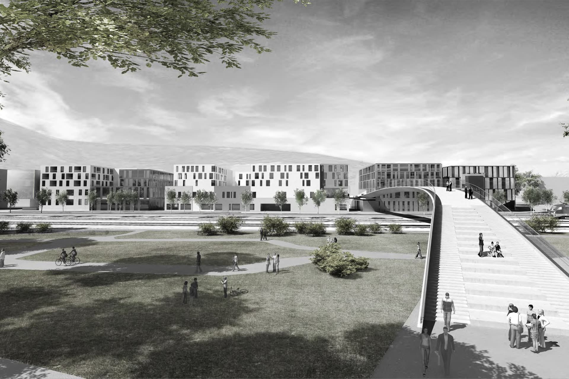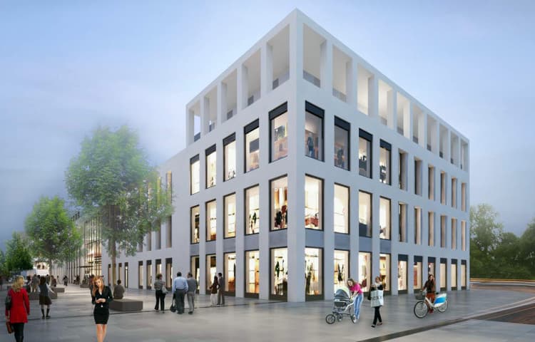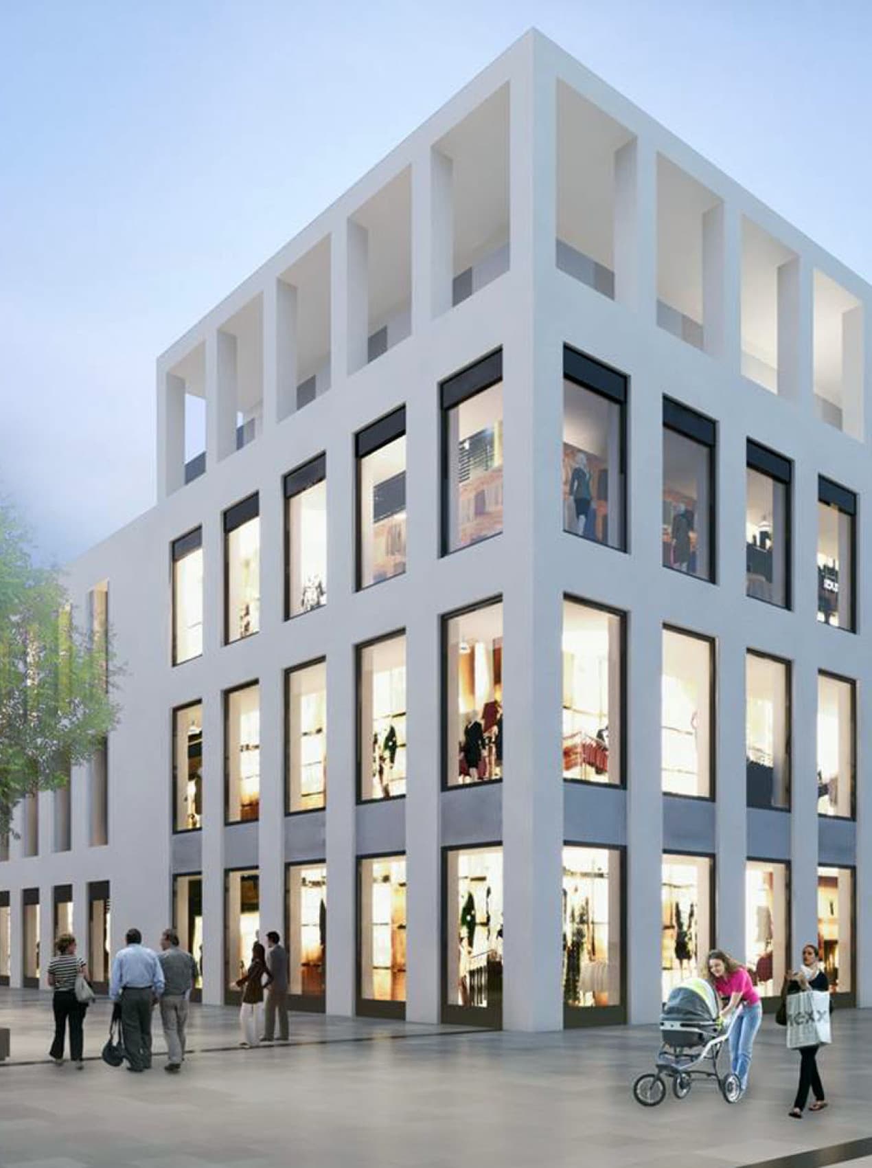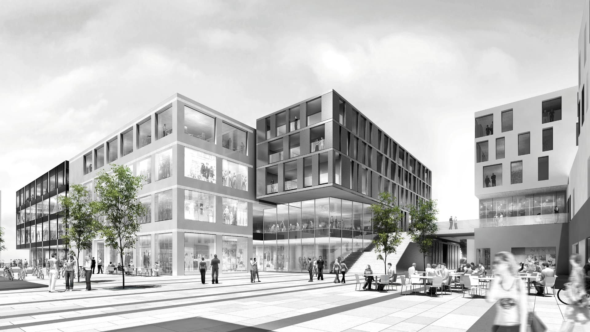 Shopping in Stadtzentrum- Atmosphäre statt im EKZ-begleitend zur Bahnhofstrasse wird eine zweite, innere Einkaufsstraße konzipiert, die dem innerstädtischen Wegenetz entspricht, welches sich durch Abfolge von kleinen Gassen und Plätzen definiert. Auf dem ca. 200 m langen Grundstück werden 3 Hauptbaukörper bewusst getrennt angeordnet, um diesen Umstand noch zu verstärken. Durch das Öffnen der Baumasse in 3 Teile werden gewohnte Proportionen angeboten, die ein vielfältiges Raum- und Einkaufserlebnis garantieren. Urbane Lebendigkeit durch Nutzungsverschränkung. Die Vielfalt der Bebauung wird durch die unregelmäßige Positionierung der unterschiedlichen Nutzungen innerhalb eines Gebäudeblocks verstärkt. Die vertikale Ausrichtung der Funktionsgruppen bildet schmale Fassadenfronten aus und verstärkt den Typus der Stadthäuser.