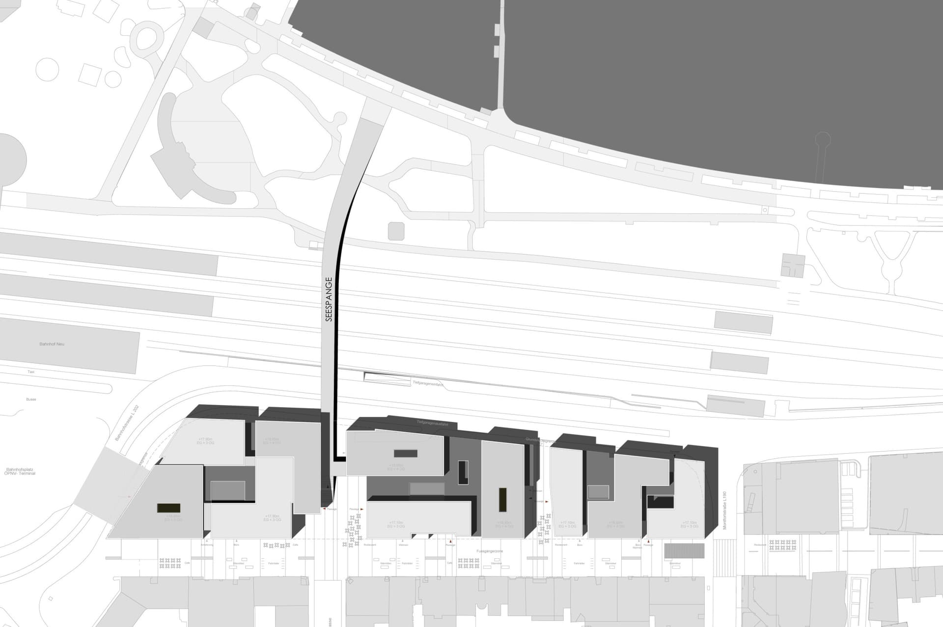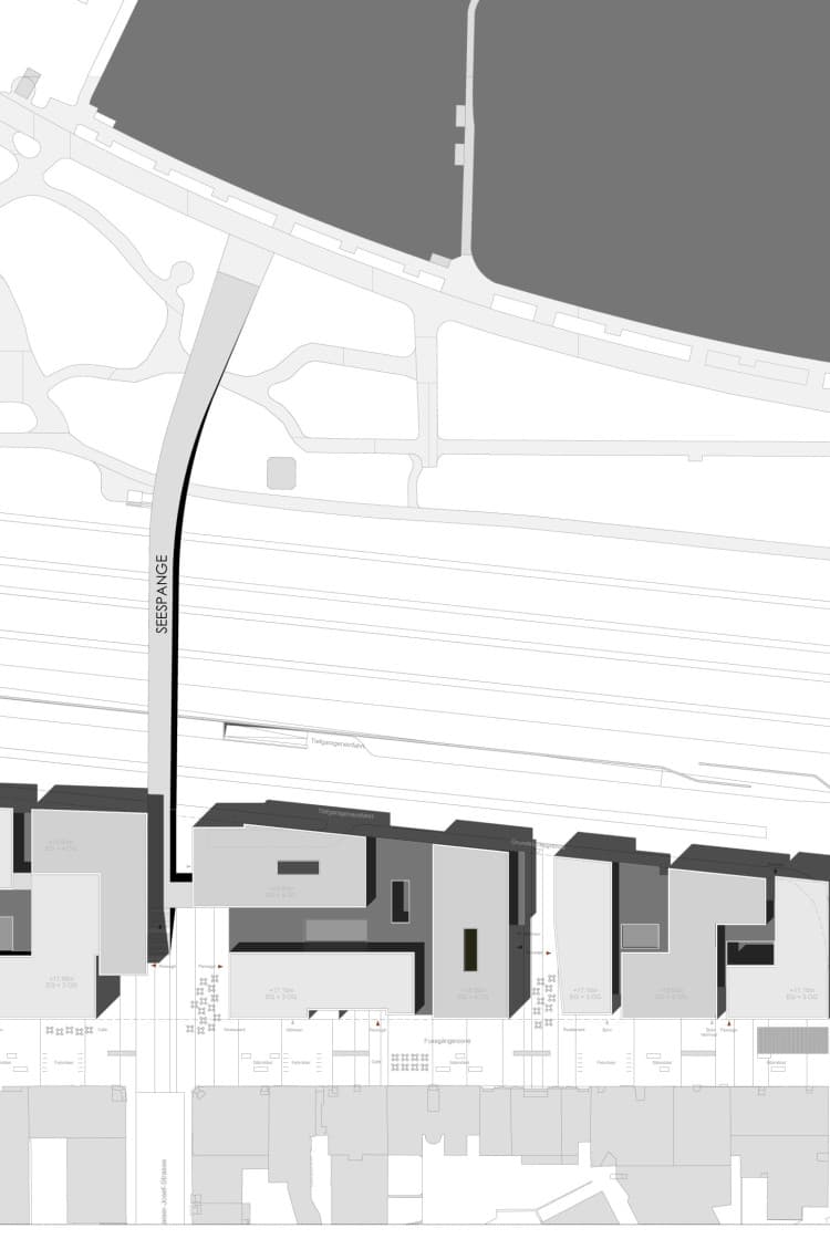 Ziel der städtebaulichen Konzeption war die Entwicklung eines kleinteilig strukturierten Bebauungssystems, das die beiden vorhandenen Bautypologien Solitärbauwerk (Seefrontbebauung) und Stadthaus im Verbund einer geschlossenen Blockbebauung (Altstadt) miteinander verknüpft und überlagert.Die Stadtkante und Seefront wird bis zu ihrem Abschluss am Bahnhof fertig gebaut und führt die Typologie überschaubar dimensionierter Solitäre an der Seestraße fort.