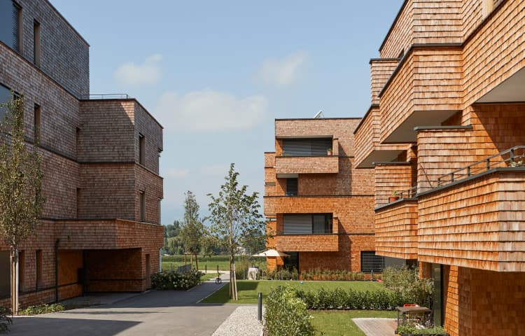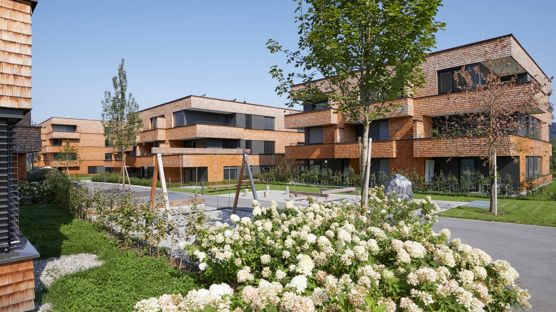 Sämtliche Gebäude sind mit einer zusammenhängenden Tiefgarage verbunden. Die gesamte Wohnanlage ist oberirdisch frei von Autoverkehr. Die Häuser sind in Ziegelbauweise mit Holzschindelfassaden ausgeführt, durch ausladende Balkone und Terrassen wird ein spannendes Fassadenbild erzeugt.