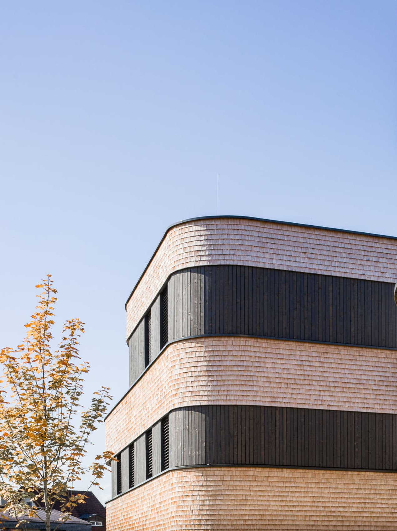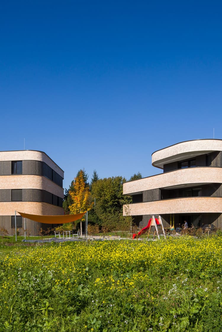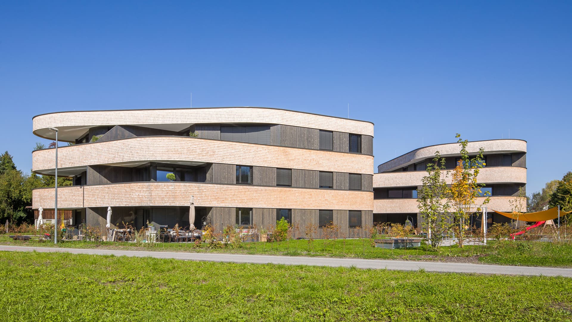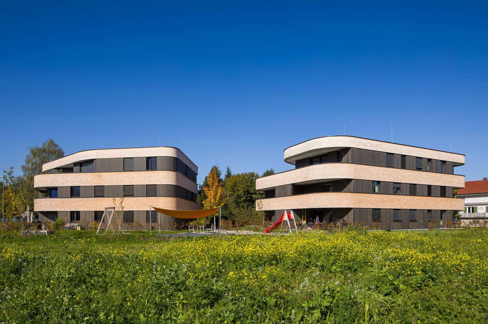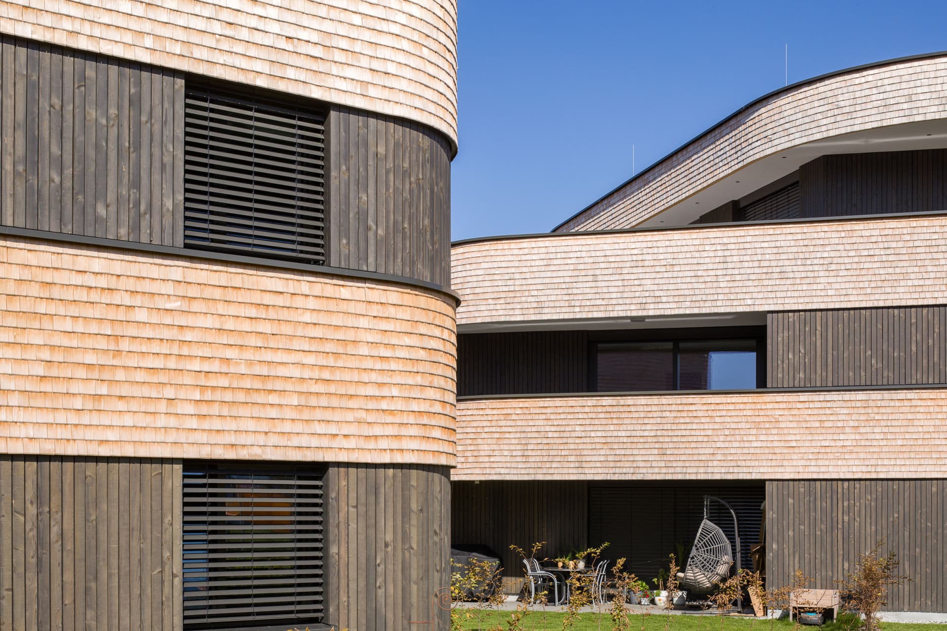 Die beiden dreigeschossigen Gebäude beinhalten insgesamt 19 Wohnungen mit großzügigen Balkonen und Terrassen in den Obergeschossen, sowie Privatgärten im Erdgeschoß. Die Außengestaltung der Fassade wurde mit bandartigen Fichtenschindelfassaden, mit dazwischen liegender stehender dunkler Holzverschalung ausgeführt. Zwischen den Gebäuden wurde ein großzügig gestalteter Gartenbereich mit Spielplatz für die Bewohner errichtet.