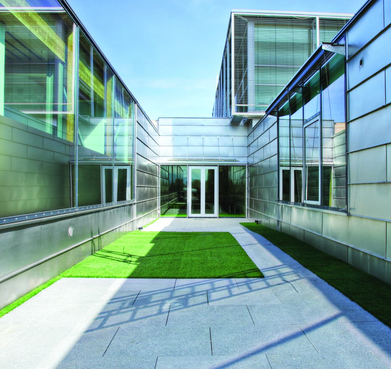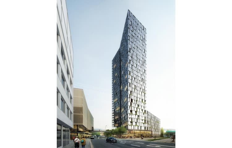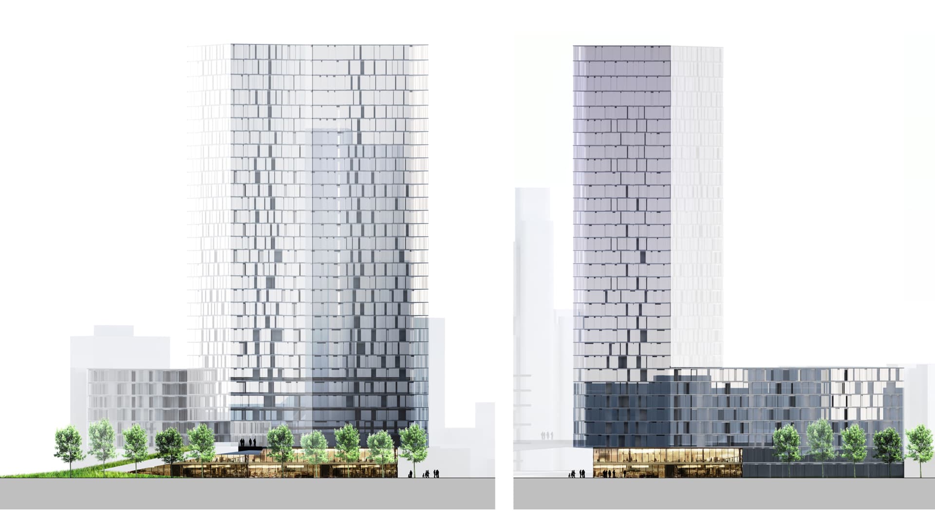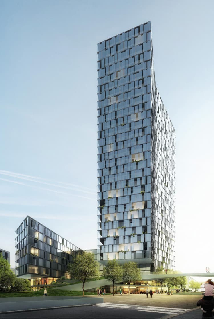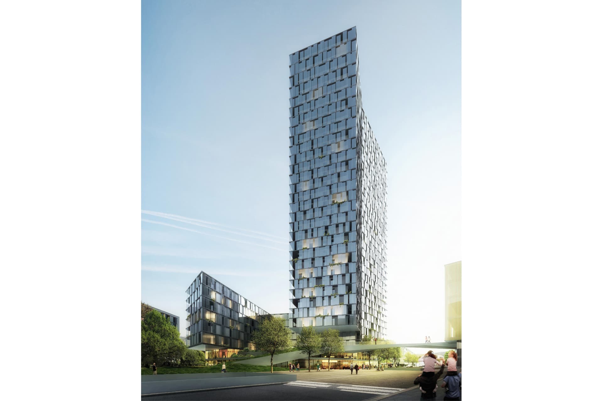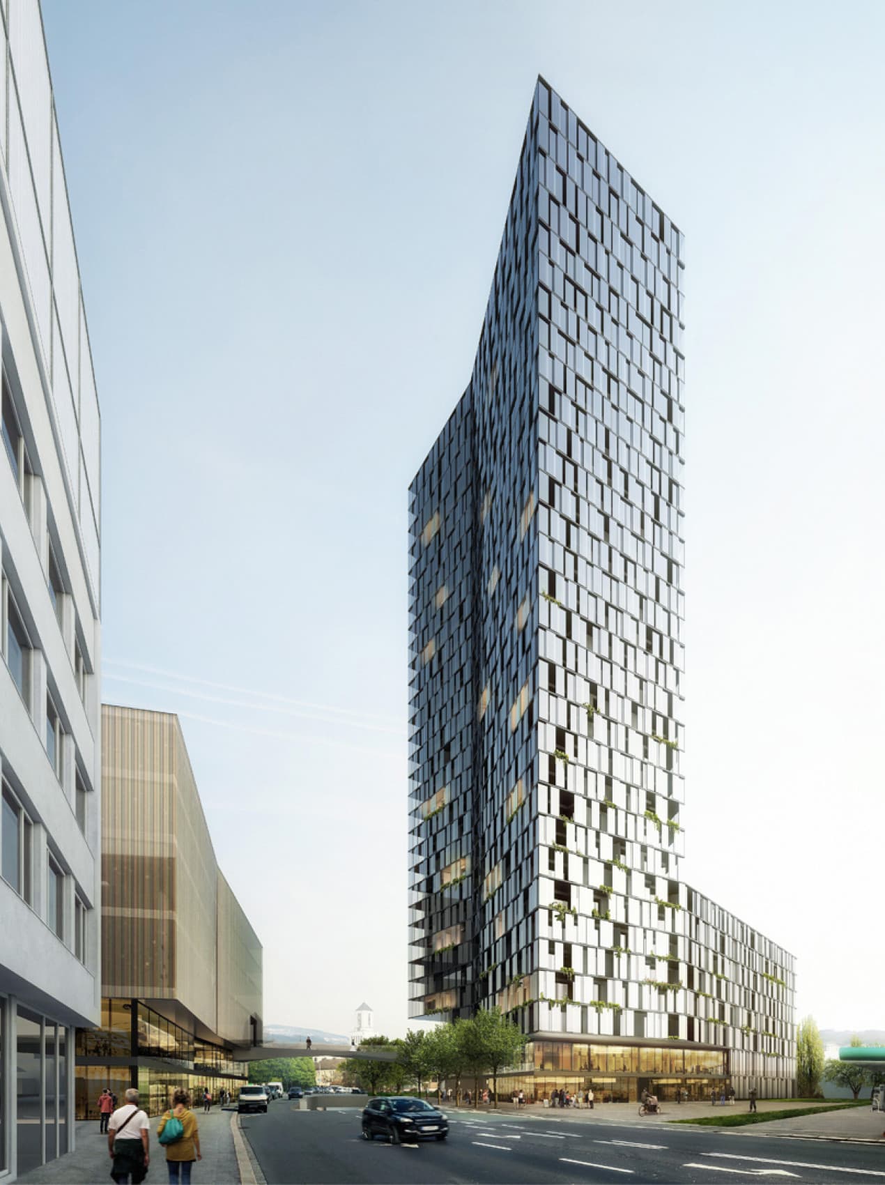 Bewusst werden Fassadenflächen in einer zurückhaltenden Differenzierung ausgebildet. Das Fassadenbild entwickelt sich aus der Tiefe der vorgelagerten Balkon- und Loggiaplatten, die partiell mit Windschutzpaneelen versehen sind. Belebtheit entsteht durch einen sich mit zunehmender Höhe verändernden Anteil an Geschlossenheit und Dreidimensionalität der Fassadenschichtung, die zudem Platz für vertikales Grün bietet.