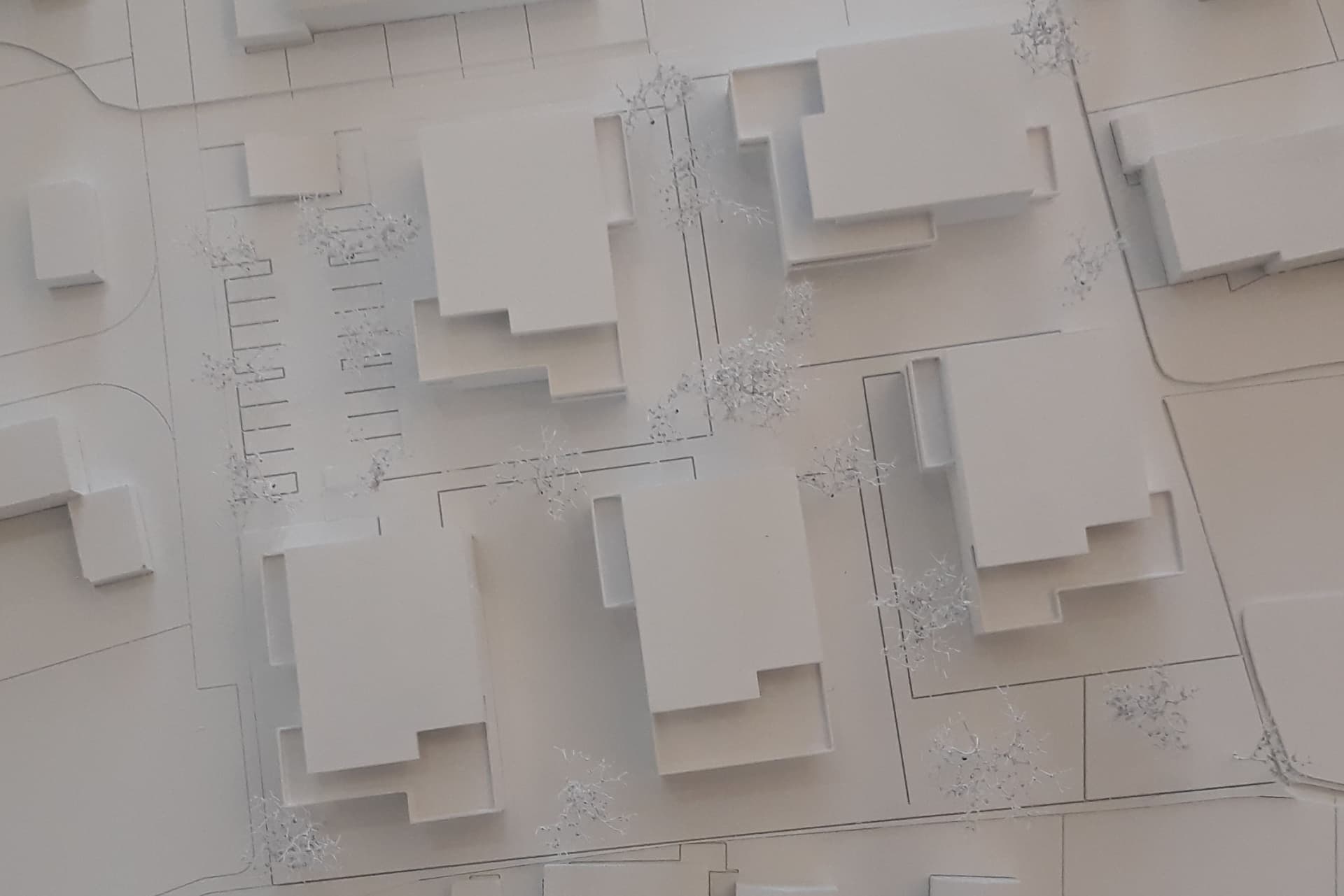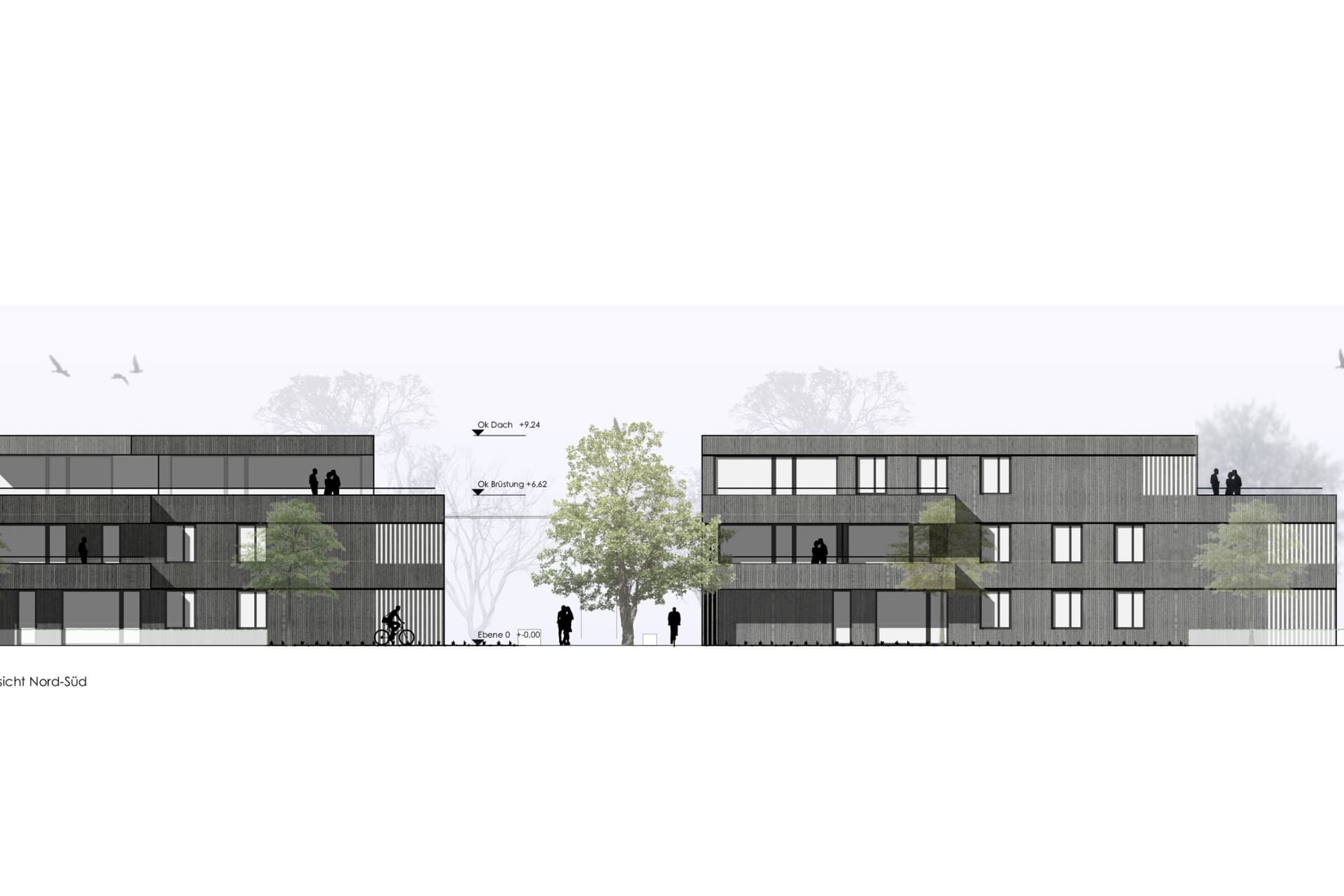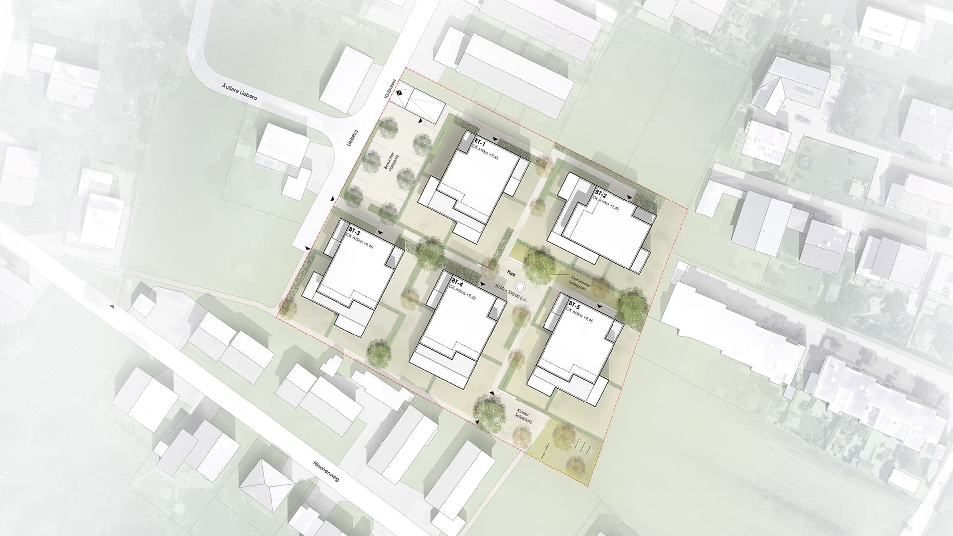 Mittels versetzter Anordnung von fünf Baukörpern wird der Bezug zu der umgebenden Struktur aufgenommen. Die Situierung der Baukörper gewährt größtmögliche Durchblicke und Besonnung der Wohnungen.