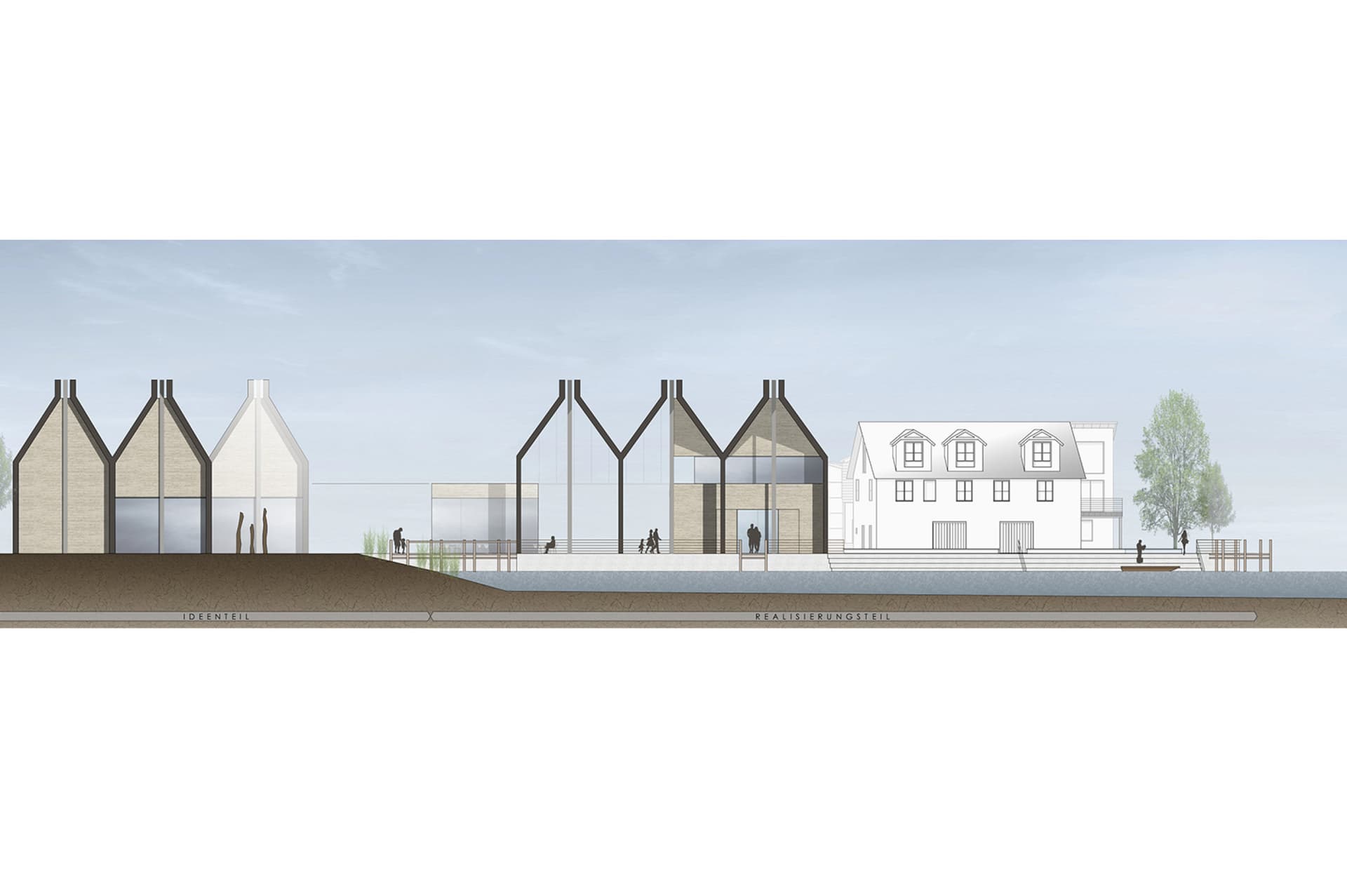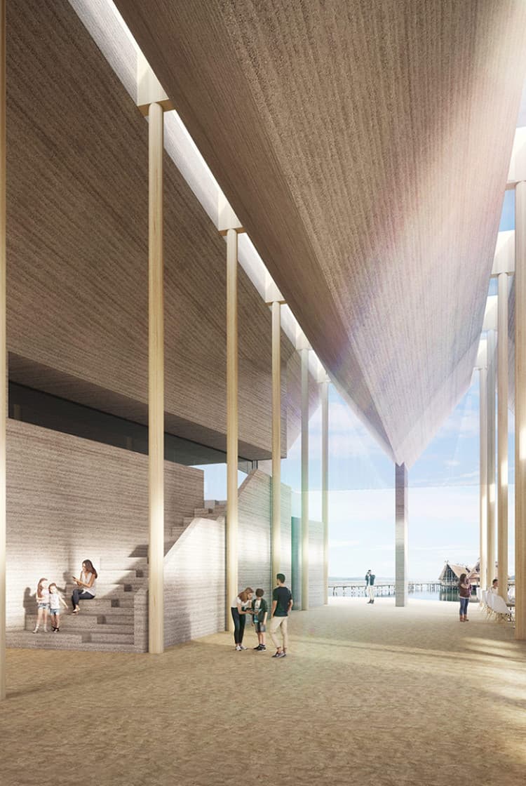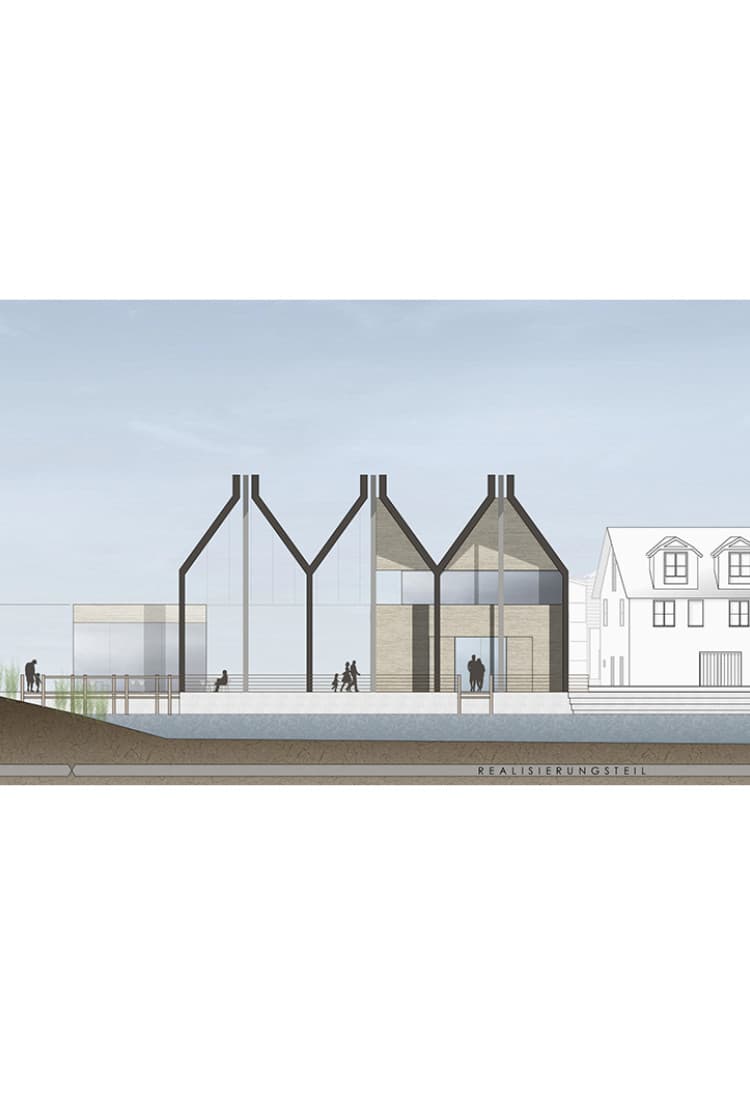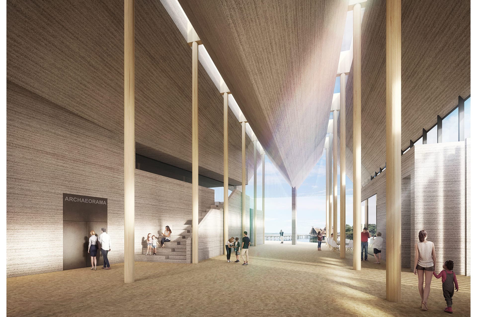 Der Entwurf sieht drei zusammenhängende Baukörper vor, welche sich formal an den historischen Pfahlbauten der bestehenden Fundstätten orientieren. Großzügige Überdachungen leiten die Besucher ins Innere zu den Kassenbereichen sowie zur Piazza, welche das Verteilerzentrum zum anschließenden Museum darstellt.