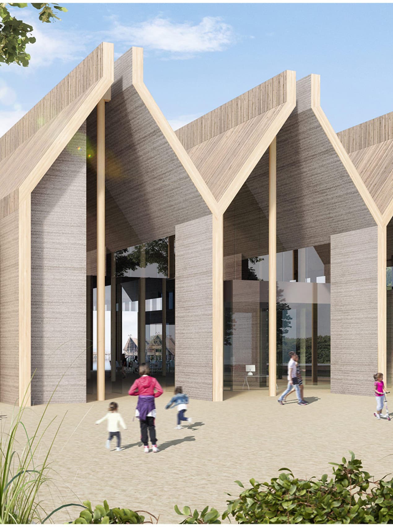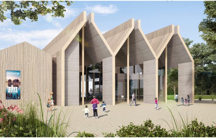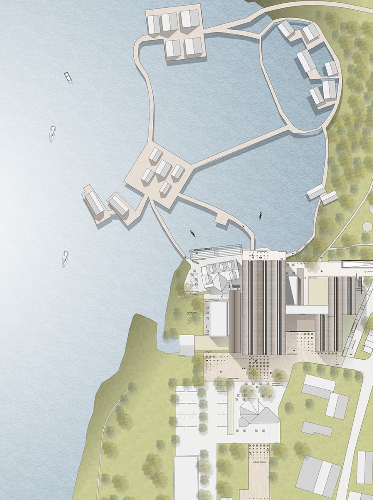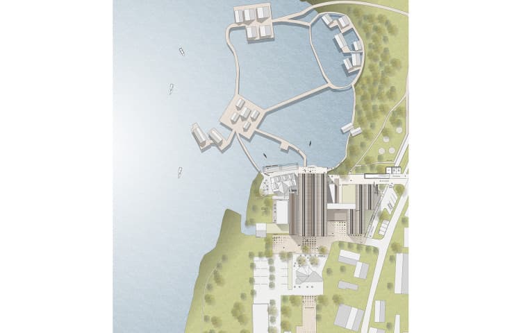 Der Entwurf sieht drei zusammenhängende Baukörper vor, welche sich formal an den historischen Pfahlbauten der bestehenden Fundstätten orientieren. Großzügige Überdachungen leiten die Besucher ins Innere zu den Kassenbereichen sowie zur Piazza, welche das Verteilerzentrum zum anschließenden Museum darstellt.
