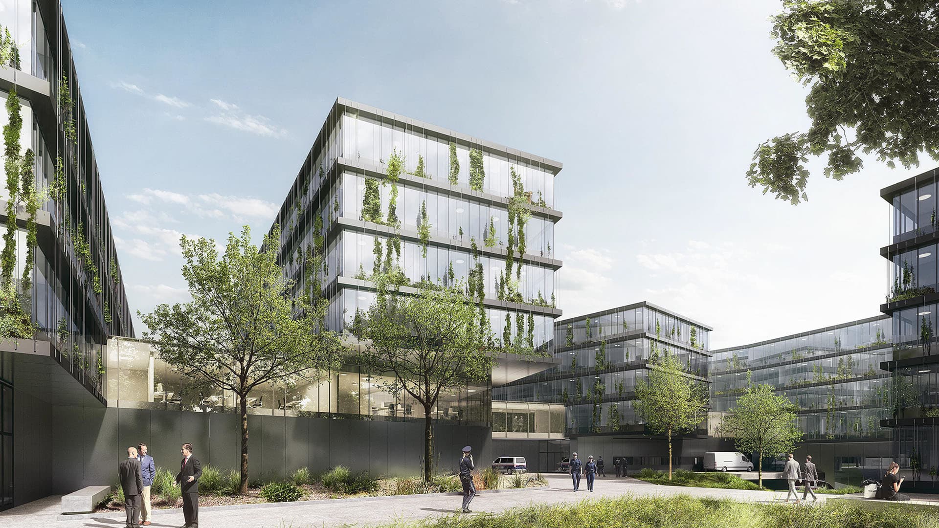 Die Baukörper sind geometrisch ausformuliert, um Sichtachsen sicherzustellen und Fassadenlängen zu strukturieren.