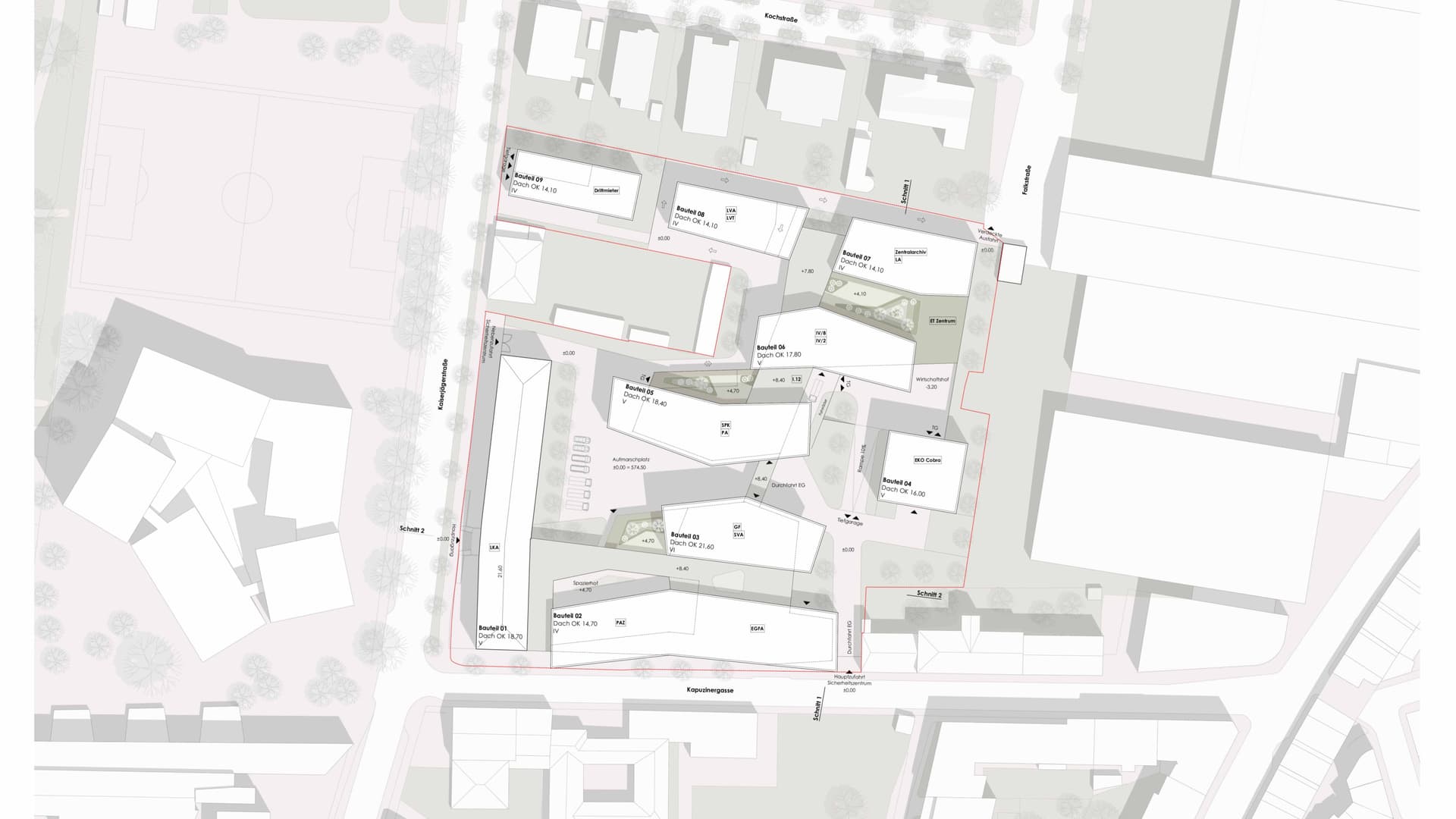 Die Bebauung reagiert mit diversen einzelnen, zusammenhängenden Baukörpern auf den städtebaulichen Bestand des Areals. Entlang der Kapuzinergasse wird die Straßenkante mit einer niedrigeren und teilweise zurückknickenden Bebauung besetzt, womit auf das gegenüberliegende Kapuzinerkloster reagiert wird.