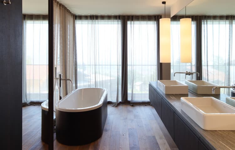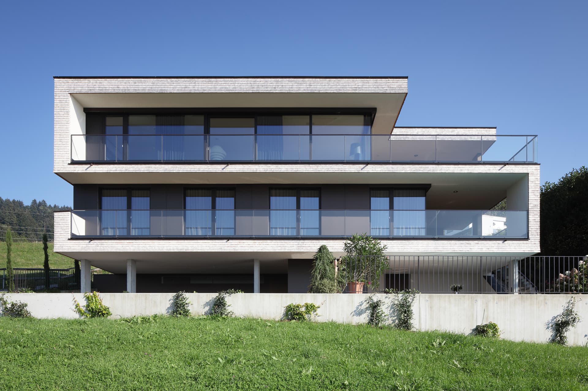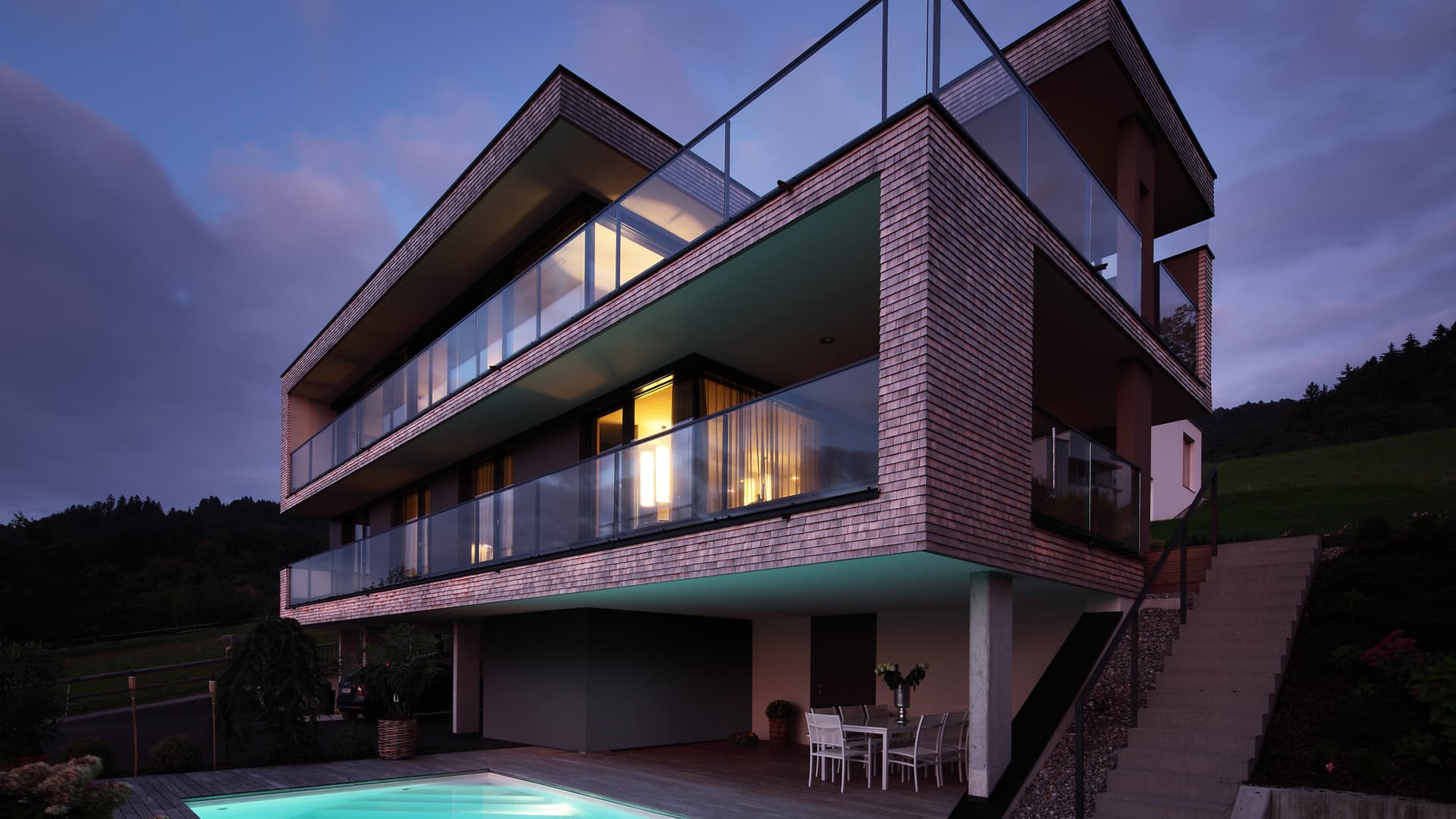 An der Südseite befindet sich eine dem Wellnessbereich vorgelagerte Loggia mit Freitreppen hinab zum Pool und andererseits hinauf zur Wohnebene. Wohnbereich, Küche und Essplatz sind auf der obersten Ebene mit einer großzügigen, südseitig orientierten Terrasse.