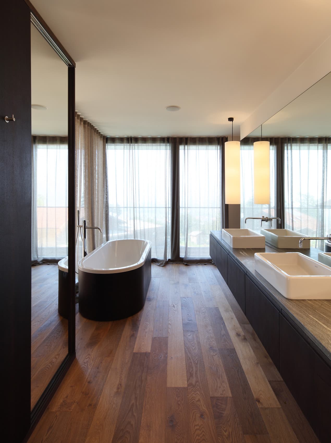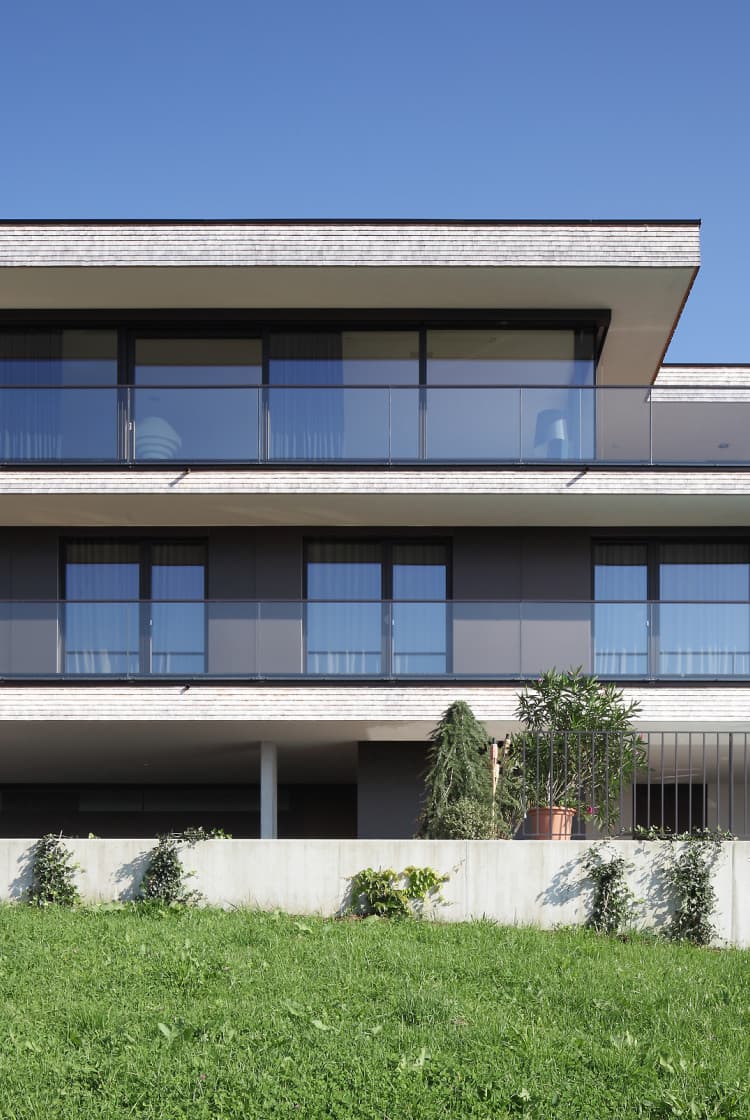 Das Gebäude ist als Einfamilienhaus konzipiert, welches sich über drei Geschosse erstreckt. Die Erschließung erfolgt von der untersten Ebene aus. Hier sind Foyer, Carport und Nebenräume untergebracht – und an der Süd-West-Ecke der Pool mit überdachten Lounge Bereich. Im mittleren Geschoss sind die Schlafräume und dazugehörigen Bäder.
