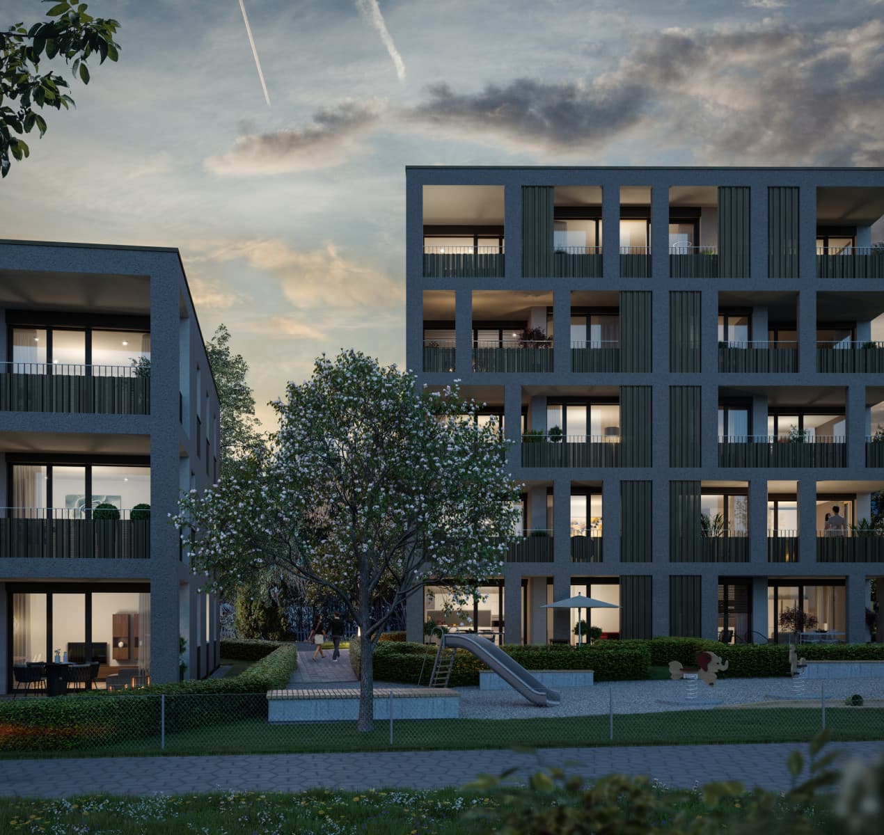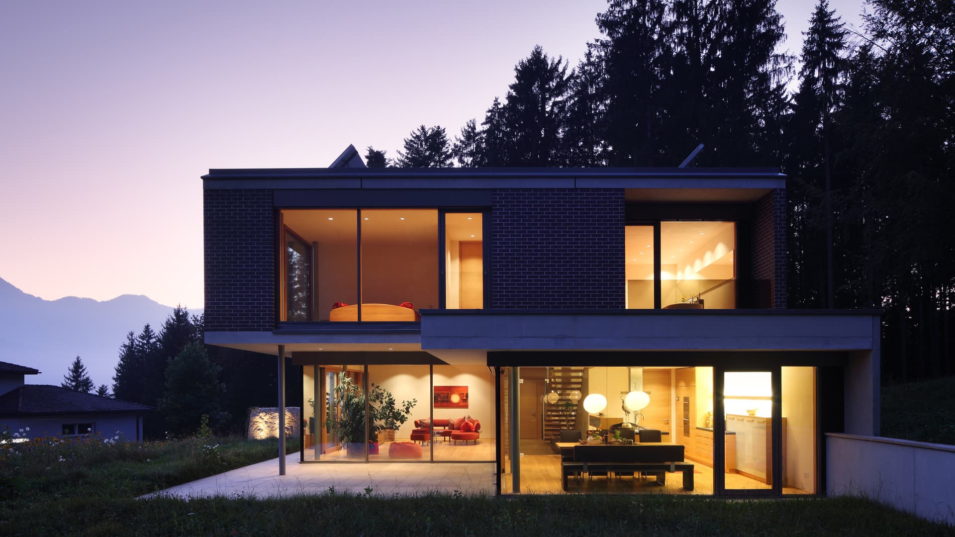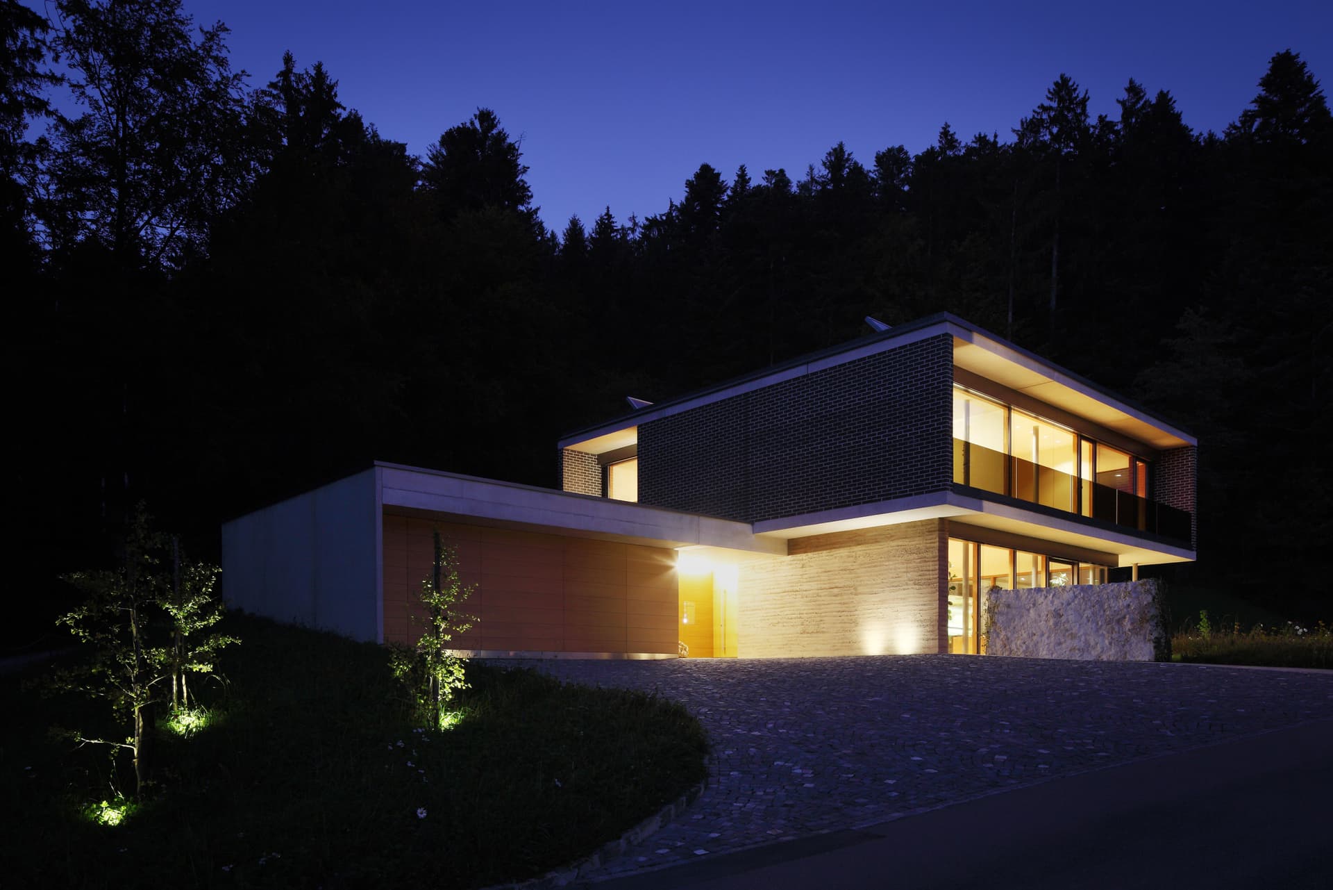 Direkt am Waldrand, in leichter Hanglage über dem Walgau, wurde in Massivbauweise mit Klinkerfassade und Sichtbetonfertigteilen ein Einfamilienhaus für ein Familie geplant und errichtet. Die Erschließung erfolgt vom Erdgeschoss aus. Hier sind Garage und Foyer, Wohnraum, Essplatz und Küche. Über eine zentrale Halle gelangt man in das Obergeschoss mit den Schlafzimmern und Bädern.