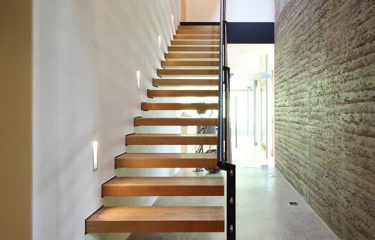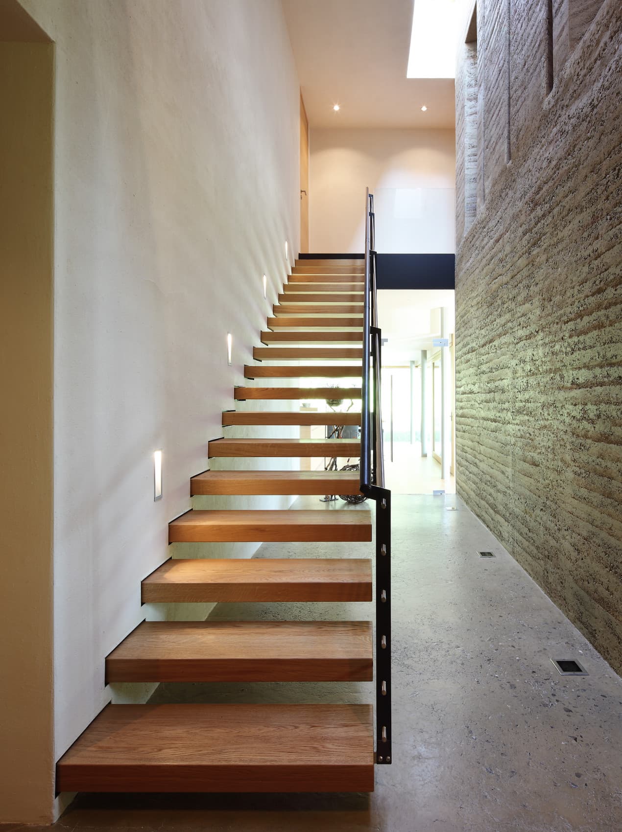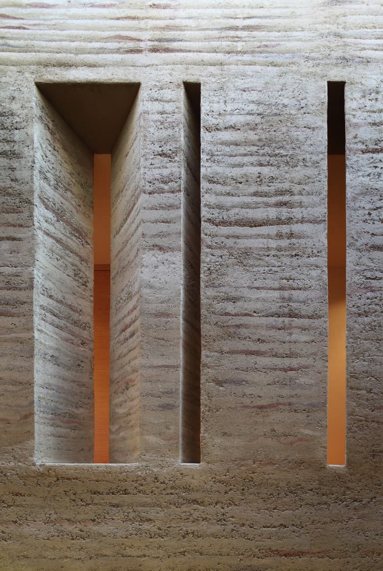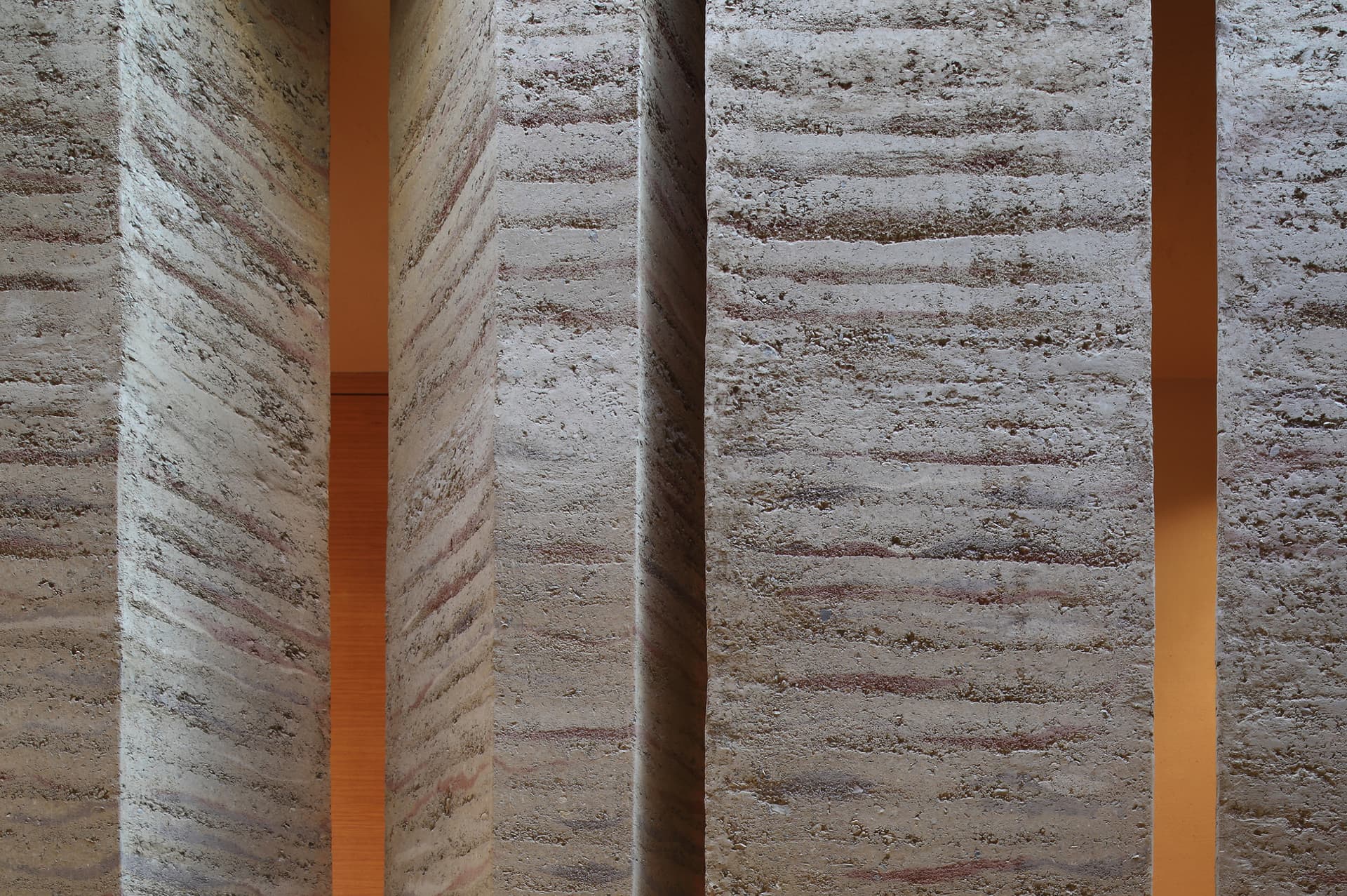 Herzstück des Hauses ist die Halle mit der zweigeschossigen Stampflehmwand. Der horizontale Schichtaufbau und die schmalen, senkrechten Sehschlitze prägen das Erscheinungsbild dieser Wandskulptur. Sie wird durch das Streiflicht der Oberlichtverglasung zusätzlich in Szene gesetzt.