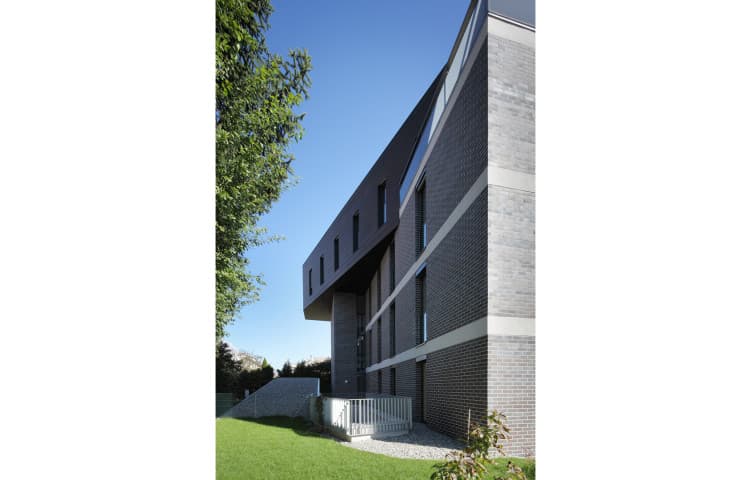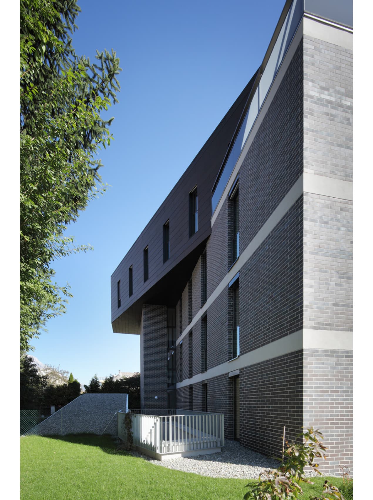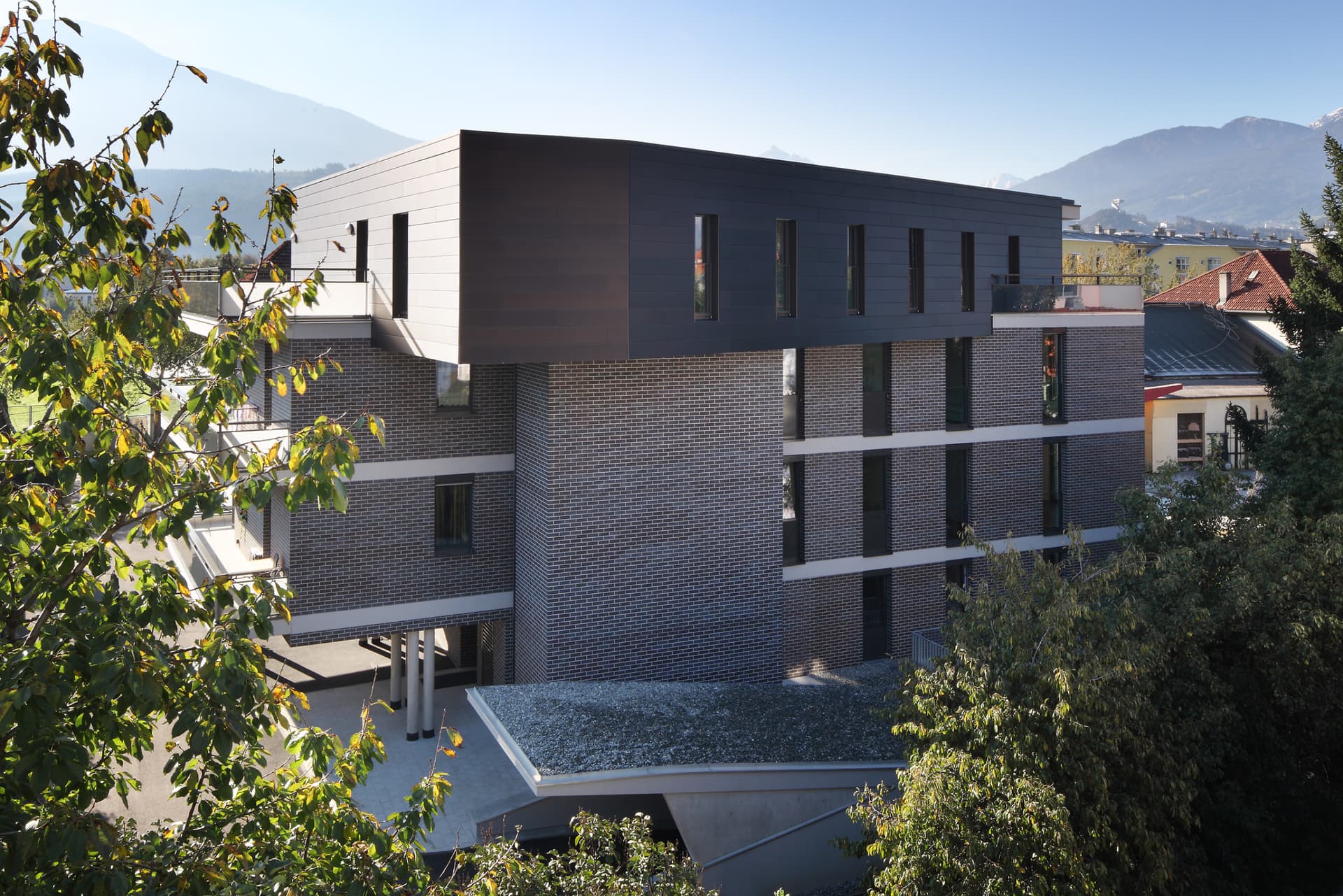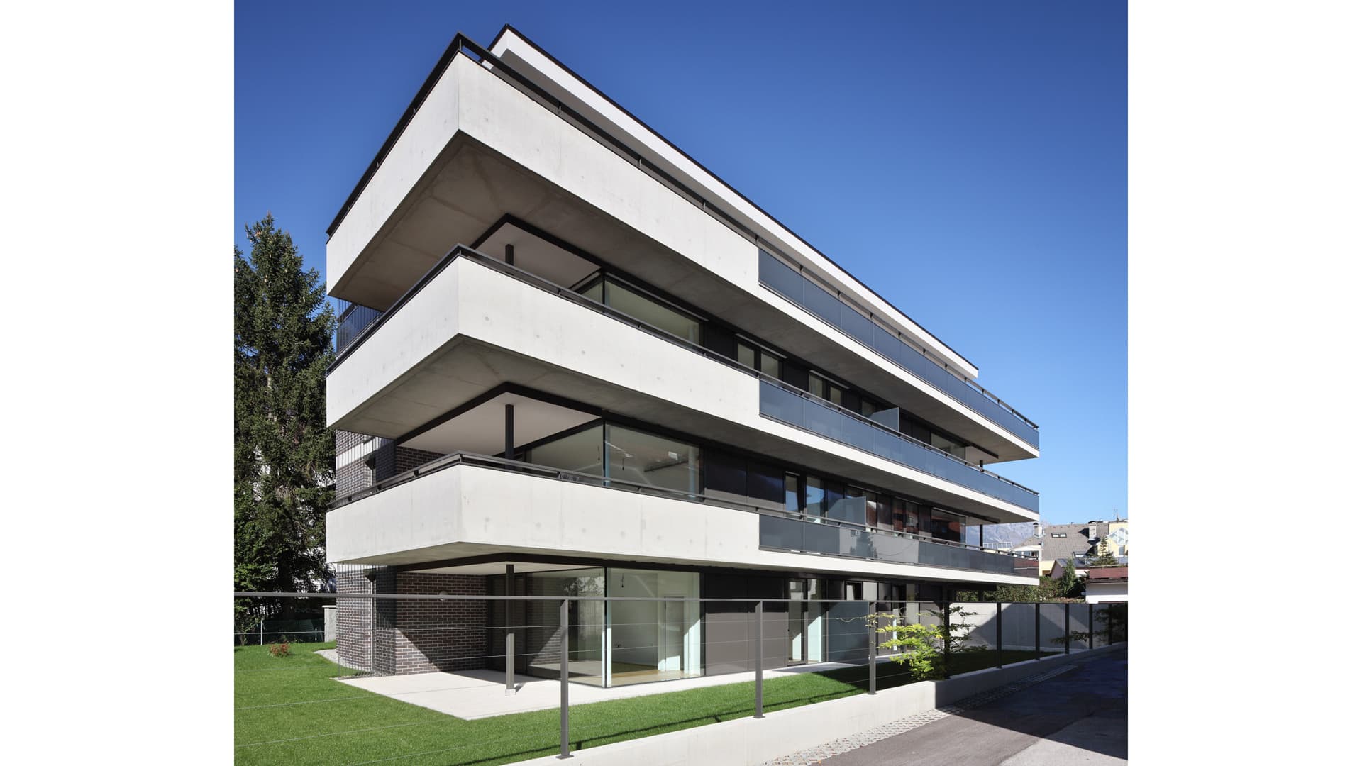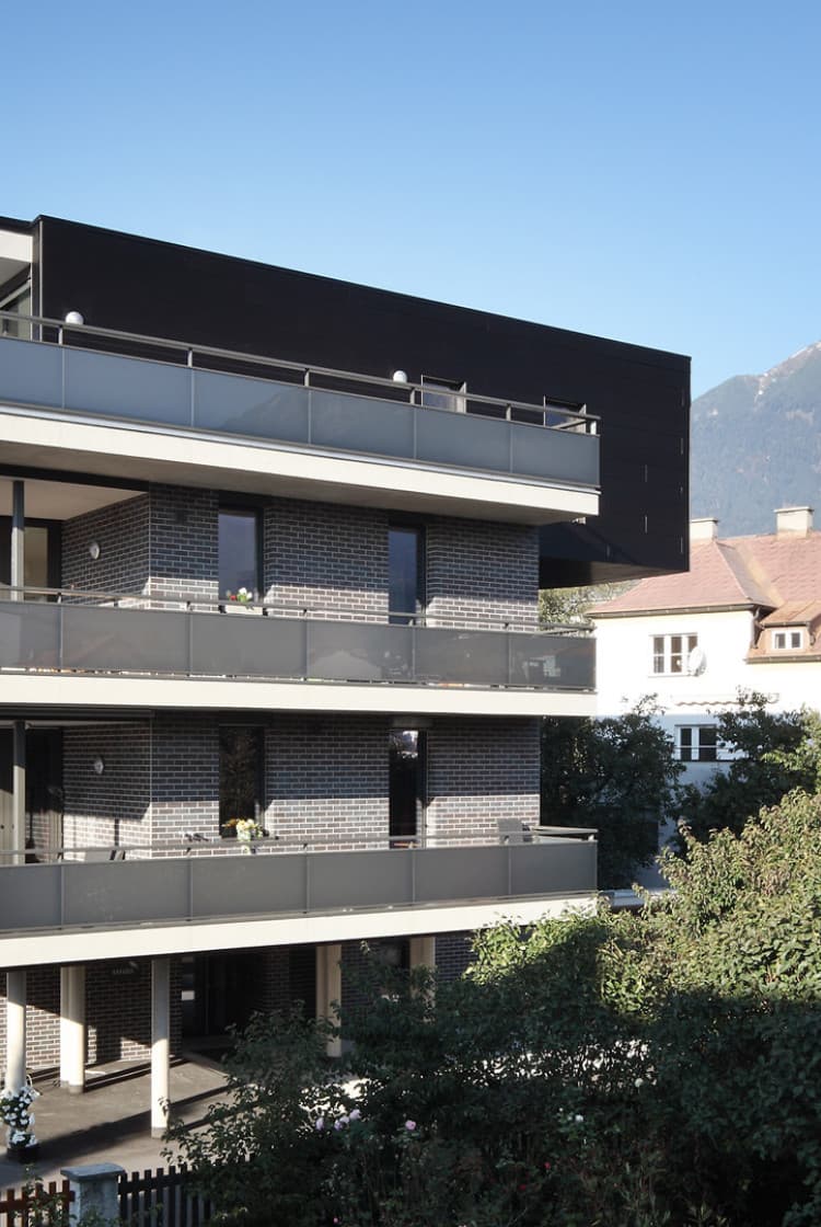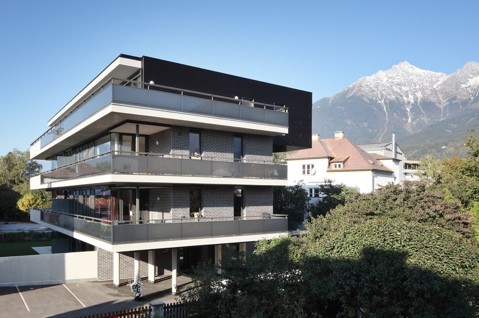Im Innsbrucker Stadtteil Pradl entstand 2010 eine 4-geschossige Wohnanlage, deren Penthousewohnung der Bauherr samt Familie selbst bewohnt. Im klar strukturierten Unterbau wurden mehrere Eigentumswohnungen samt einer Tiefgarage verwirklicht, den Abschluss bildet das aufgesetzte Dachgeschoss, das sich formell von den anderen Geschoßen unterscheidet: Wie ein Vogelnest aus bronzefarbenen, eloxierten Aluminiumplatten sitzt das Penthouse über den mit Klinker ummantelten Geschoßebenen, an mancher Stelle überragt die Konstruktion sogar den Unterbau. Dadurch entstehen großzügige, nach 3 Seiten umlaufende Terrassenflächen