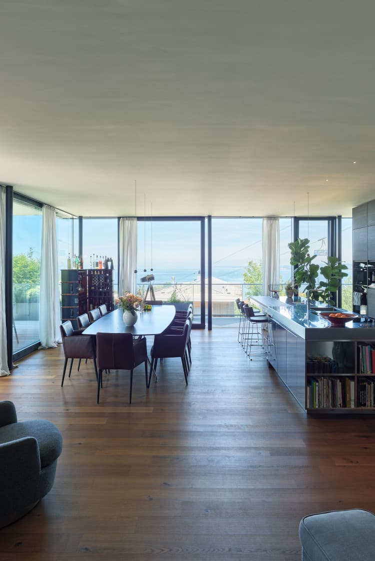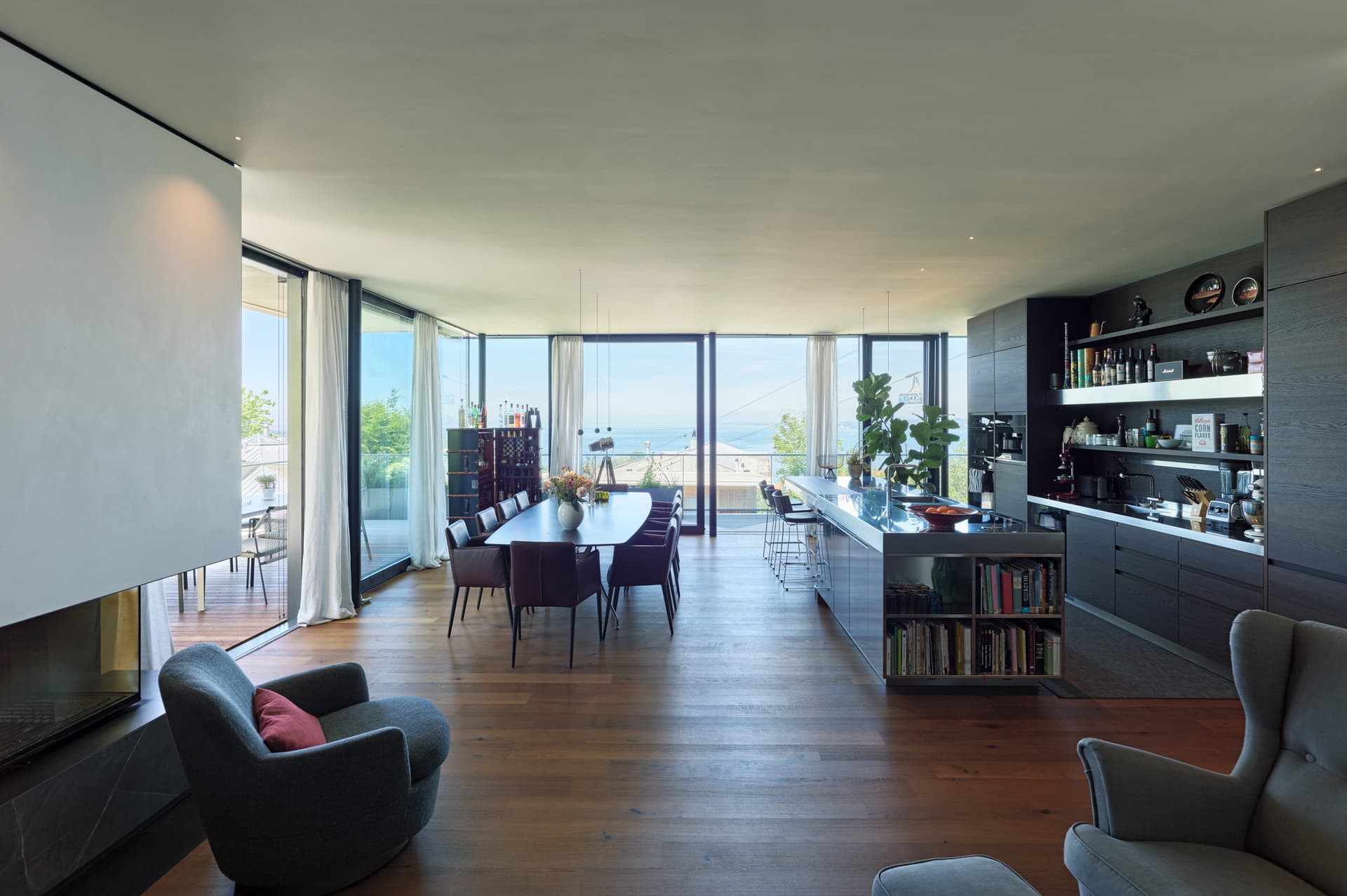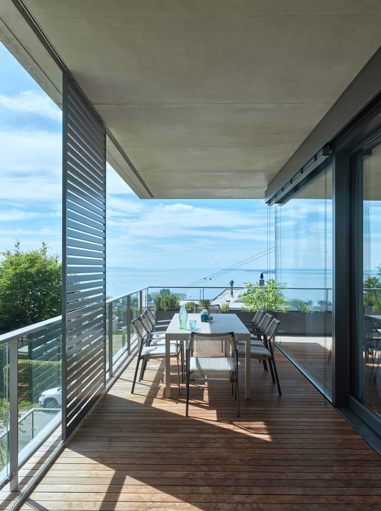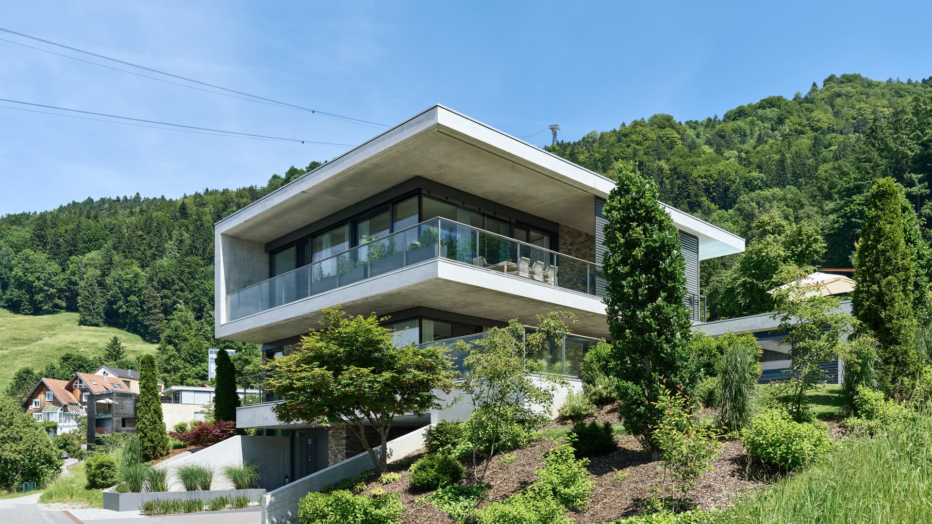 Das Haus liegt am Pfänderhang mit Orientierung zum Bodensee und ins Rheintal, es erstreckt sich über drei Ebenen, wobei die oberste den offenen Wohnbereich beinhaltet. In den unteren Ebenen befinden sich Schlafräume und diverse andere Funktionsbereiche der Großfamilie. Die Erschließung erfolgt von der unteren Etage, der Zufahrts- und Eingangsebene.