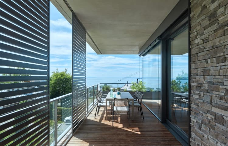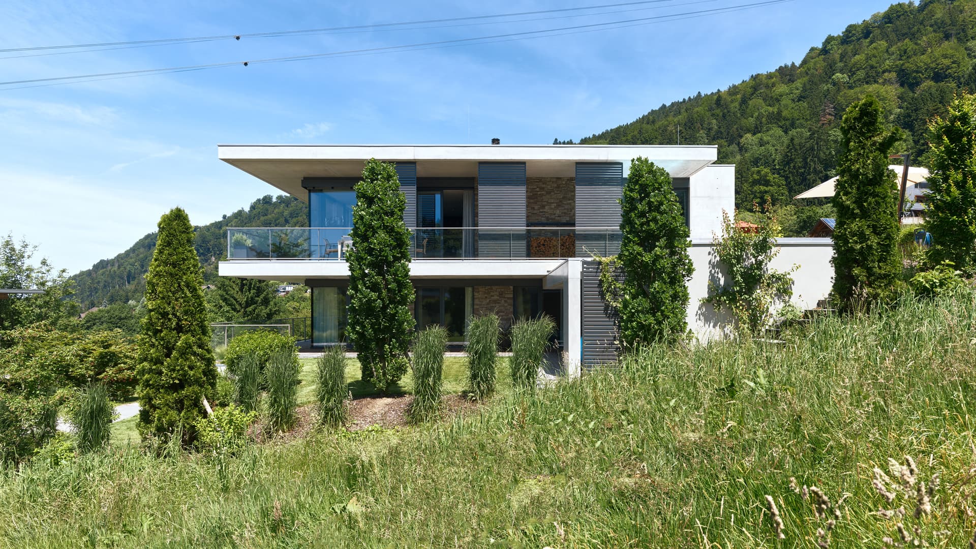 Prägende Elemente des Gebäudes sind weit auskragende Sichtbetonvordächer, raumhohe Holzaluverglasungen samt Schiebetüren, sowie dazwischen liegende Steinfassaden. Die Nordfassade nimmt sich als schlichte Sichtbetonfassade zurück. Zusätzlichen Sonnen- und Sichtschutz gewähren die verschiebbaren Lamellen-Elemente der oberen Terrasse. Ein Infinity Pool und darunter liegende Außensauna formen einen Quertrakt zum Hauptgebäude und bilden einen vor Fallwinden geschützten, hofartigen Gartenbereich.